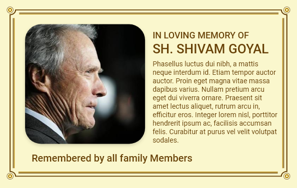 Remembrance advertisement is like if you do something in remembrance of a dead person or your relatives, you do it as a way of showing that you want to remember them and that you respect them and always missing you. Remembrance ad published in Run on line (ROL) form also and Newspapers rates are very economical. The Run on line (ROL) advertisement will publish in newspapers with the photograph. Sample design is in this page. we have more options like Classified display advertisement (width is retracted in 3 cm and height is minimum 5 cm and maximum is your choice till 52 cms) and we do display advertisement no restriction in width (minimum 4 cm x 4 cm and maximum any thinks as you like or as per your need. The Silent joy or remembering a loved one. The moments you shared together. Little moments that make life beautiful. Share them with Friends relatives, Neighbors, Colleagues with all those whose lives the departed Soul has touched. Because while life goes on, when you share memories, they stay on forever..